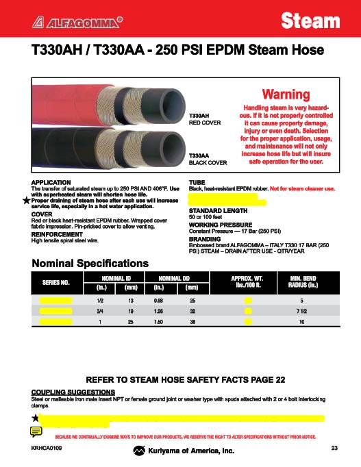 STEAM HOSE AH-RED/AH-BLACK : EPDM T330AH / T330AA - 17 BAR OR 250 PSI T330AH /T330AA - 250 PSI EPDM STEAM HOSE APPLICATION:The transfer of saturated steam up to 250 PSI AND 406°F. Use with superheated steam will shorten hose life. * Proper draining of steam hose after each use will increase service life. * Not recommended for washdown applications where detergent or oils are present. WORKING PRESSURE : Constant Pressure — 17 Bar (250 PSI)