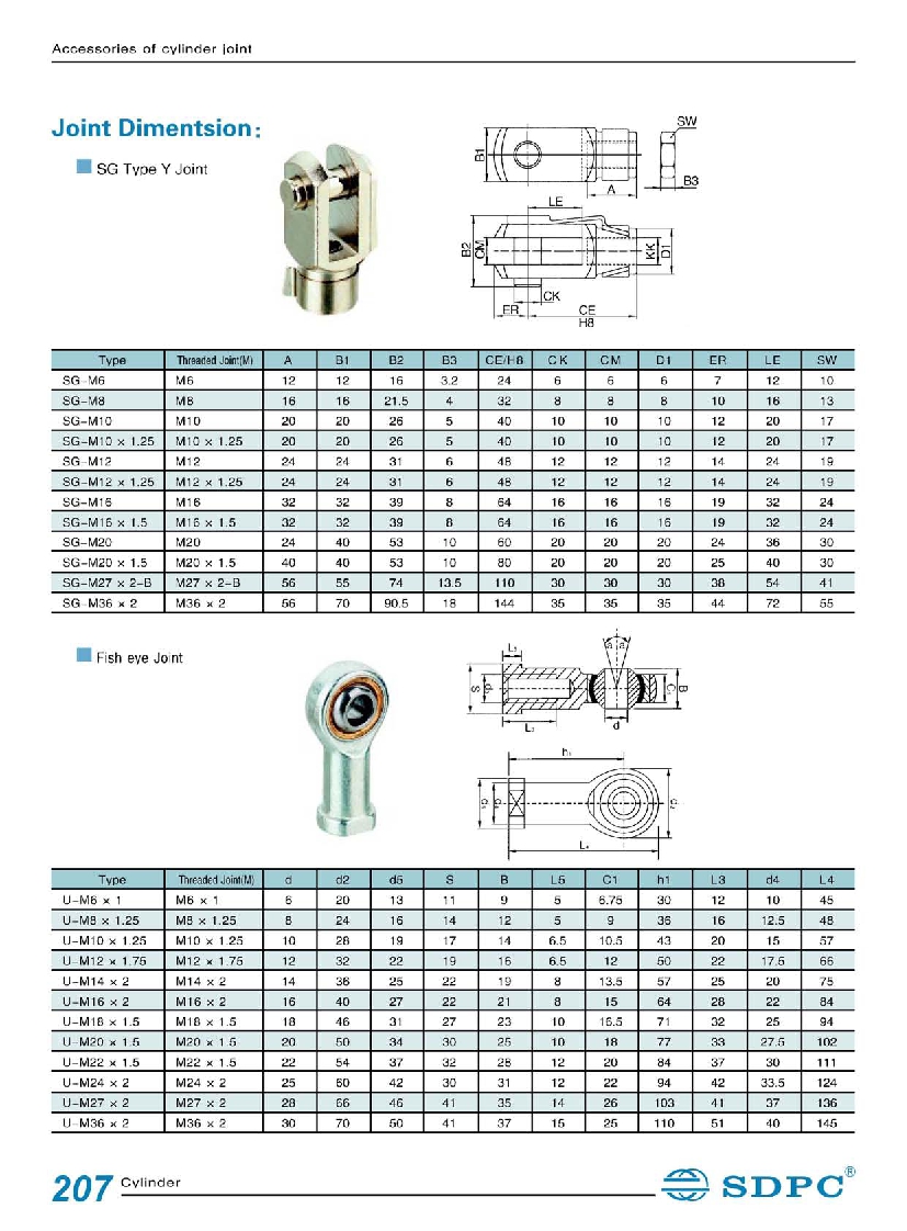 Float And Joint (จ๊อยต่อร่วมปลายแบบกระบอกลม ลักษณะขยับแกนขึ้น-ลง): F-M10x1.25,F-M12x1.25,F-M16x1.50,F-M20x1.50,F-M27x2.00,F-M36x2.00, SG-M6 ,SG-M8, SG-M10, SG Type Y-Joint: SG-M6,SG-M8,SG-M10x1.25,SG-M12,SG-M12x1.25,SG-M16,SG-M16x1.50,SG-M20,SG-M20x1.50,SG-M27x2-B,SG-M36x2.00