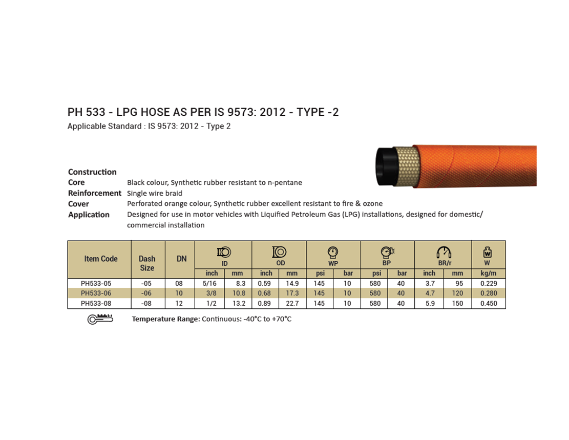PH533-LPG HOSE AS PER IS 9573:2012-TYPE-2 Applicable Standard : IS 9573: 2012 - Type 2 Application : Designed for use in motor vehicles with Liquified Petroleum Gas (LPG) installations, designed for domestic/ commercial installation