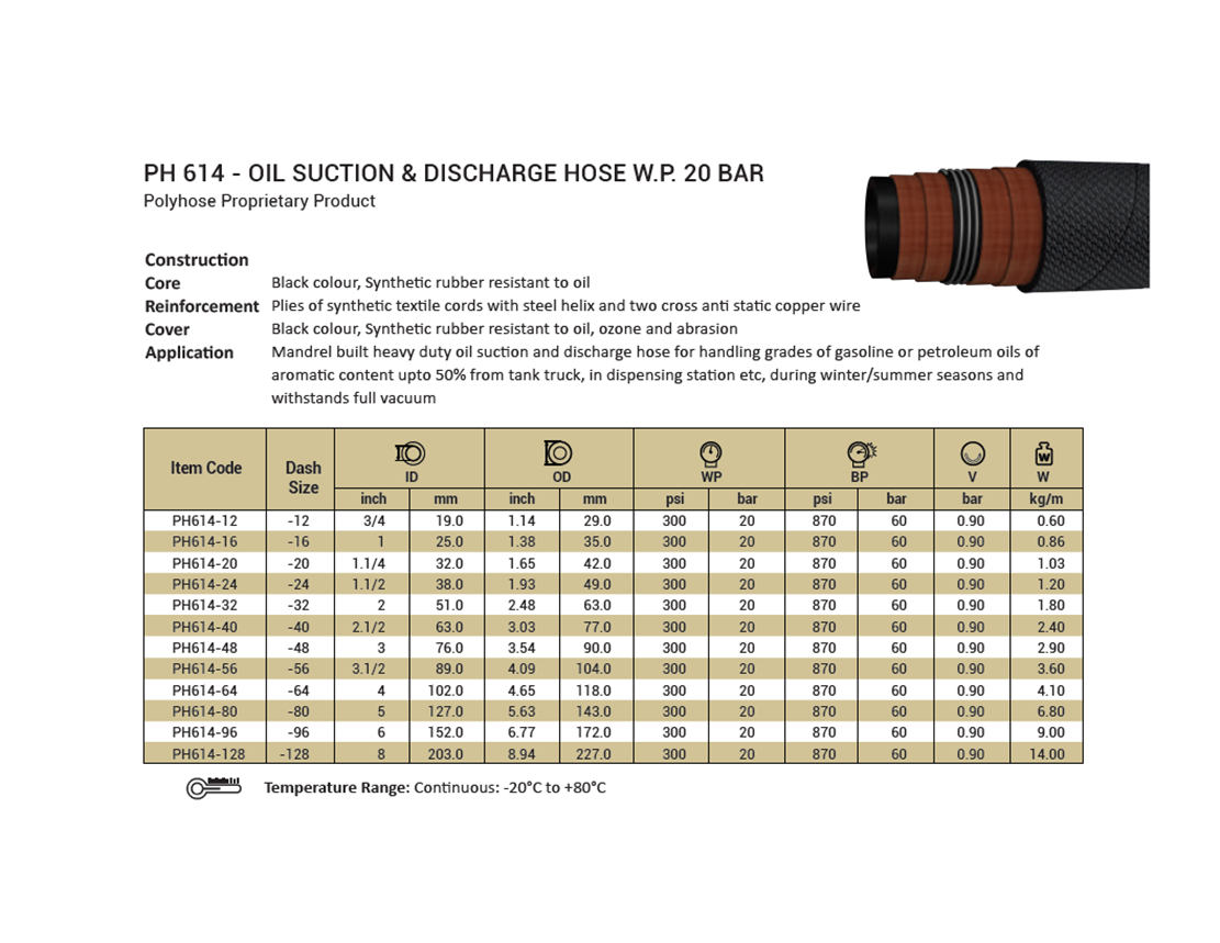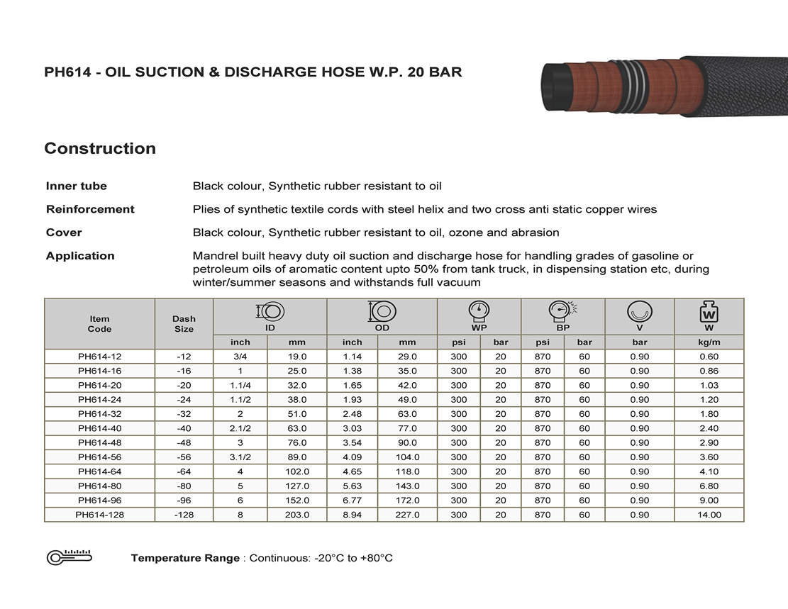 PH614 - OIL SUCTION & DISCHARGE HOSE W.P. 20 BAR Application : Mandrel built heavy duty oil suction and discharge hose for handling grades of gasoline or petroleum oils of aromatic content upto 50% from tank truck, in dispensing station etc, during winter/summer seasons and withstands full vacuum