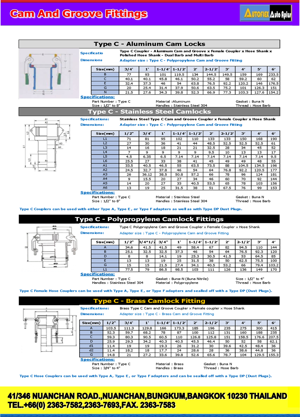 CAMLOCK AND GROOVE FITTINGS TYPE C-MAT. POLYPROPYLENE All Poly Couplers and Adapters ● The Type C coupler is ordinarily used with a matching size Type E adapter ● However, this Type C coupler can be used with a identical size Type A or Type F adapters. ● They can be sealed closed with a Type DP (Dust Plug) of matching size.
