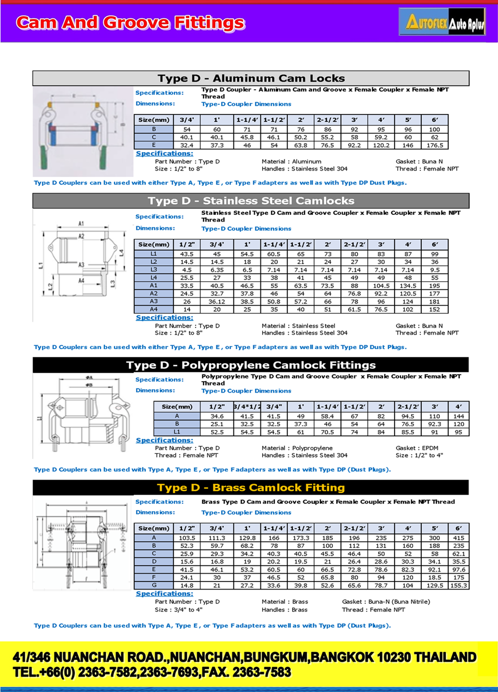CAMLOCK AND GROOVE FITTINGS TYPE D-MAT. POLYPROPYLENE All Poly Couplers and Adapters ● The Type D coupler is ordinarily used with a Type A adapter. ● However, this Type D coupler can be used with a Type E or Type F adapters. ● They can be sealed closed with a Type DP (Dust Plug) of matching size.