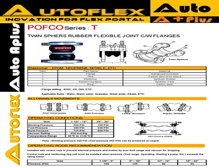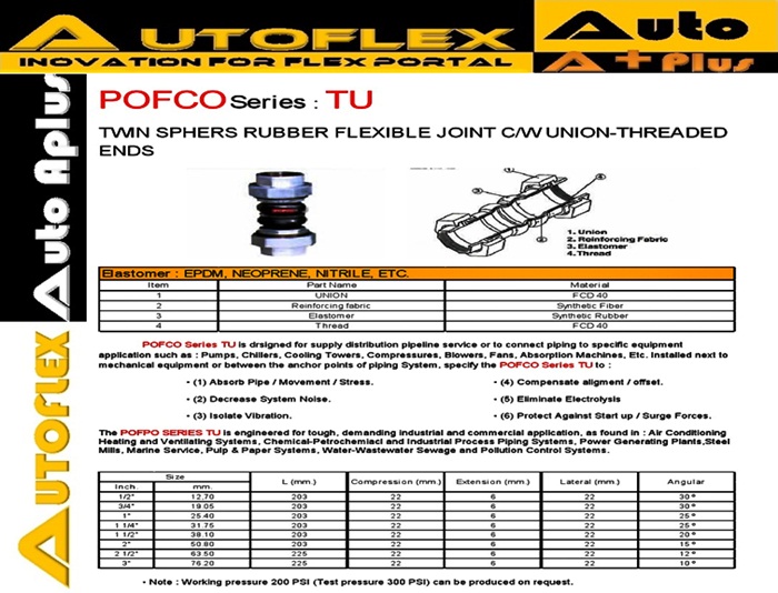POFPO Rubber flexible joint are desi gned for tough demanding  indusreial application,as found in : Air conditioning-heating and ventilating systems,chemical-petrochemical and industrial process piping systems. Power generating systems, marine service, pulp & paper systems,water-wastewater sewage and pollution control system. Instsalled next to mechanical equiment or between the anchor point of piping system. Specify the POFPO Rubber flexible joint to :