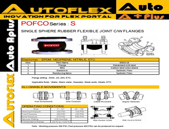 RUBBER FLEXIBLE JOINT SINGLE SPHERE. MAT. EPDM, NEOPRENE, NBR : SERIES S, C/W FLANGES. ANSI-JIS-DIN FIG : J, A, G, T, FCD 40