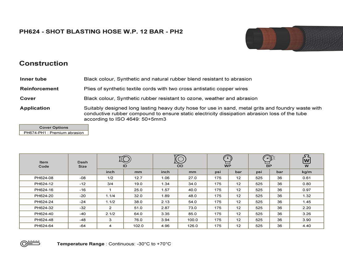PH624 - SHOT BLASTING HOSE W.P. 12 BAR - PH2 Application : Suitably designed long lasting heavy duty hose for use in sand, metal grits and foundry waste with conductive rubber compound to ensure static electricity dissipation abrasion loss of the tube according to ISO 4649: 50+5mm3 Cover Options : PH674-PH1 : Premium abrasion