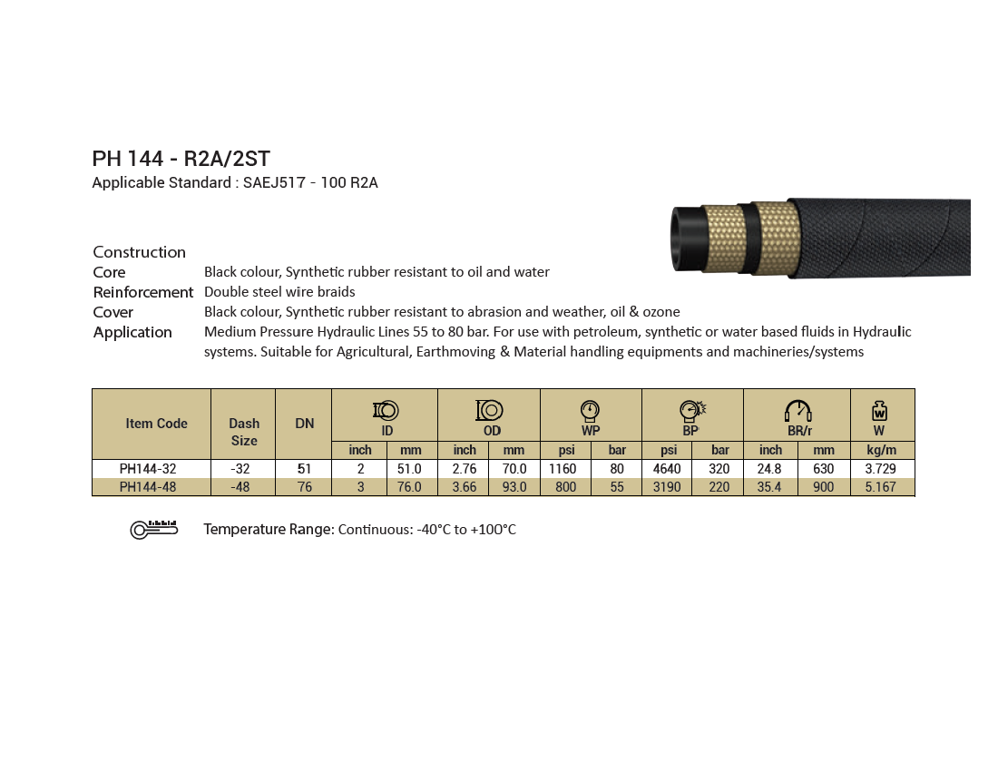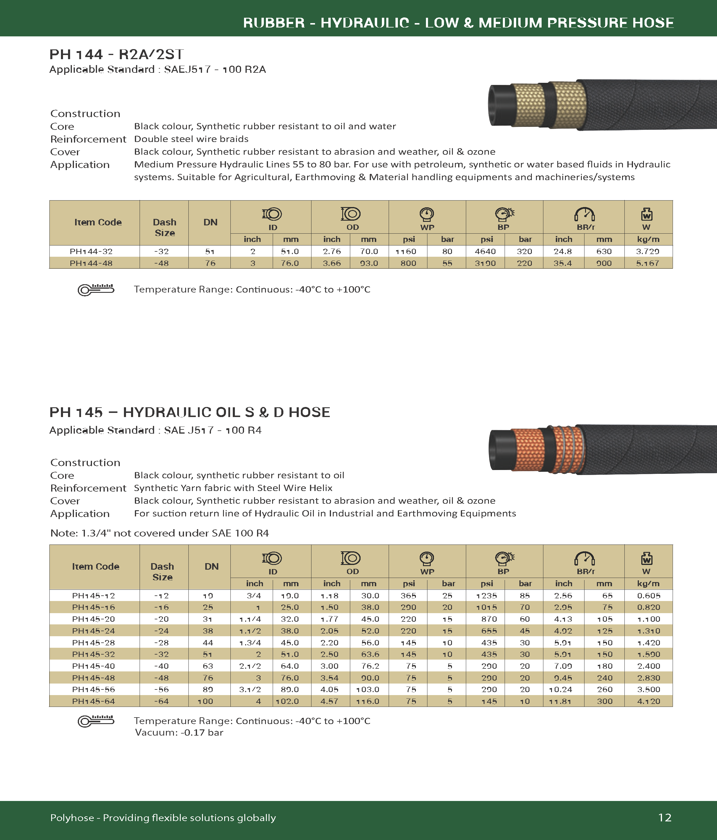 E-Catalog > Hydraulic Rubber Hose : POLYHOSE > PH144 - SAE J517-100-R3 / EN 854 /LOW PRESSURE AND LOW IMPULSE HYDRAULIC LINES 30 TO 110 BAR