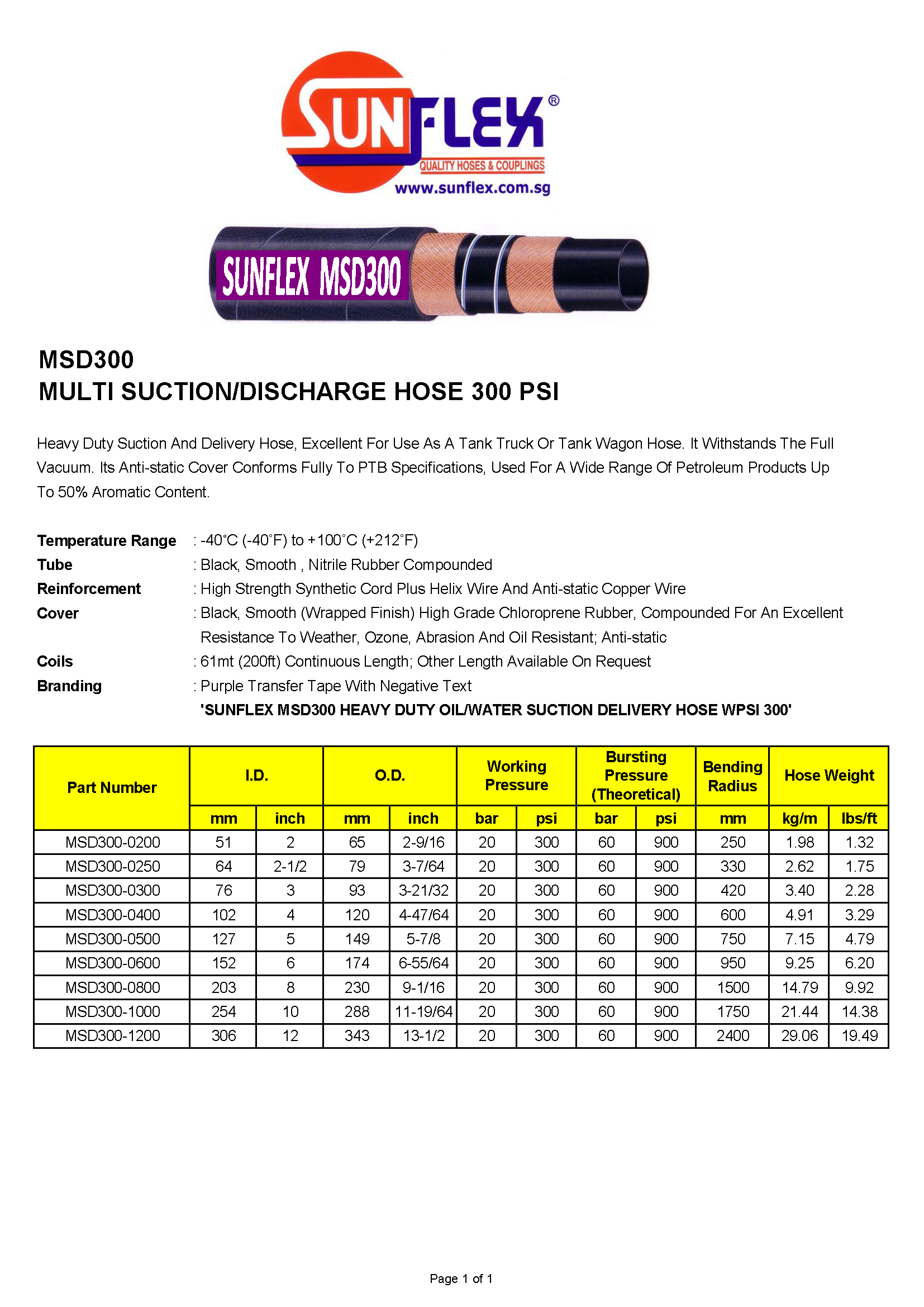 'ท่อส่งน้ำมัน/น้ำสำหรับงานหนัก SUNFLEX MSD300 WPSI 300'