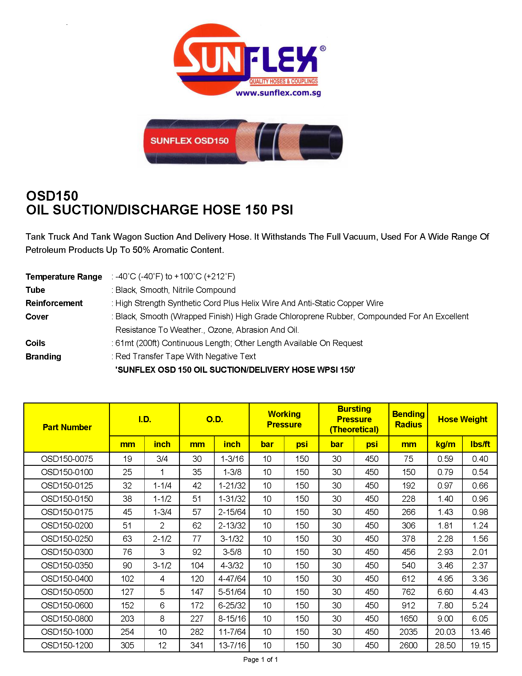 'SUNFLEX OSD 150 OIL SUCTION/DELIVERY HOSE WPSI 150'