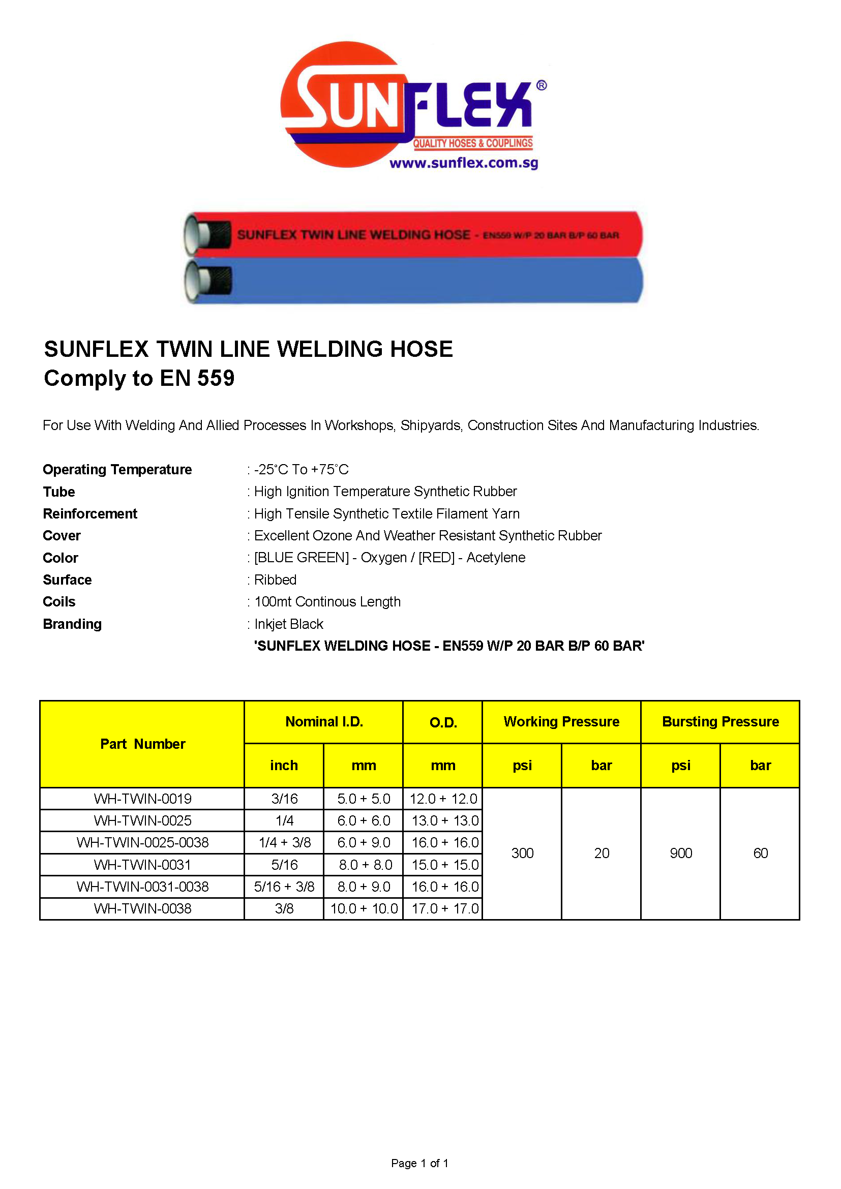'SUNFLEX WELDING HOSE - EN559 W/P 20 BAR B/P 60 BAR'