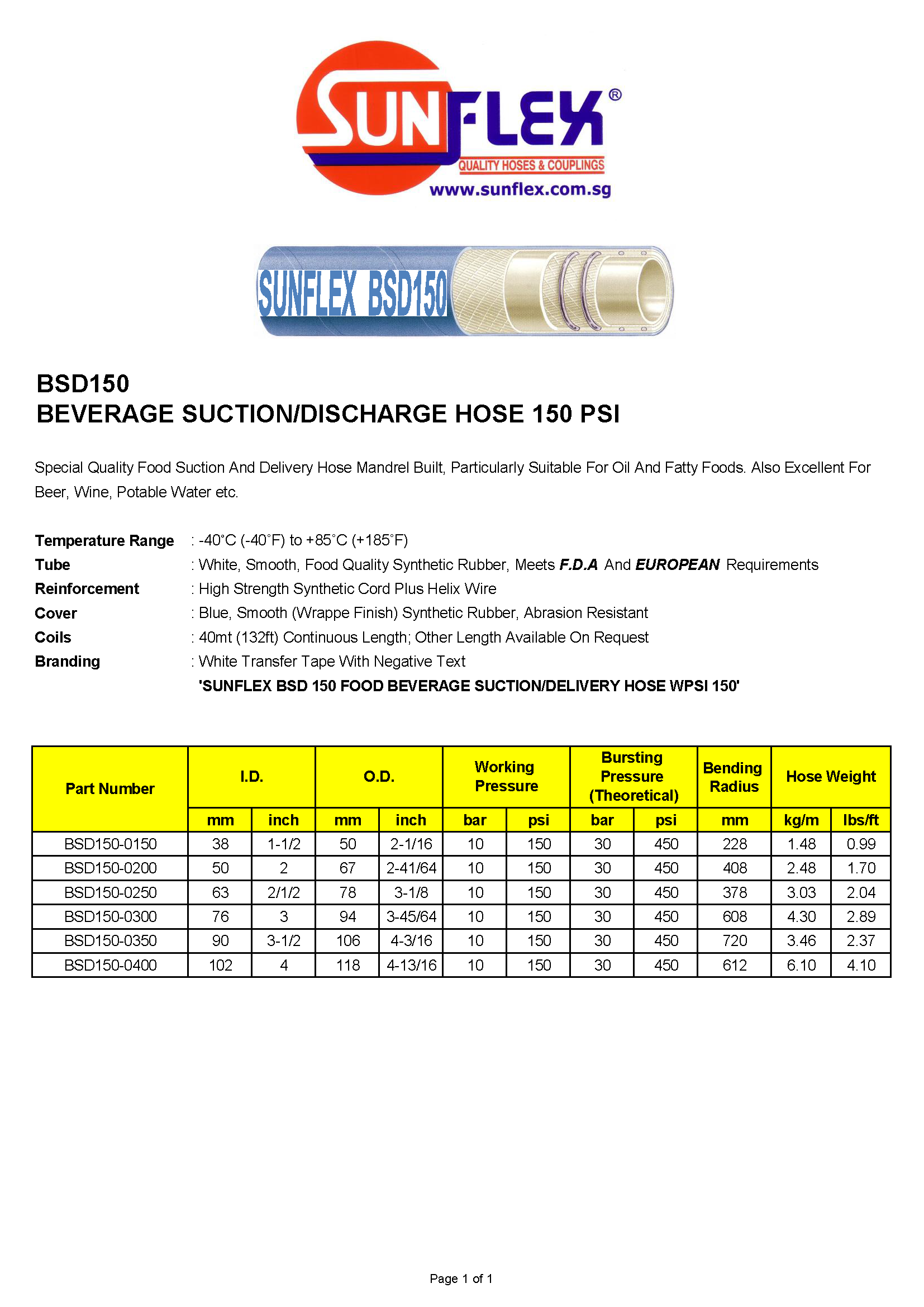 'SUNFLEX BSD 150 FOOD BEVERAGE SUCTION/DELIVERY HOSE WPSI 150'