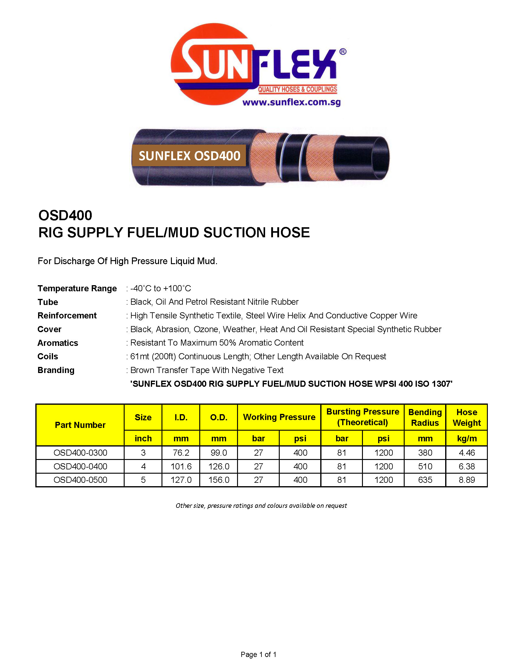 'SUNFLEX OSD400 RIG SUPPLY FUEL/MUD SUCTION HOSE WPSI 400 ISO 1307'
