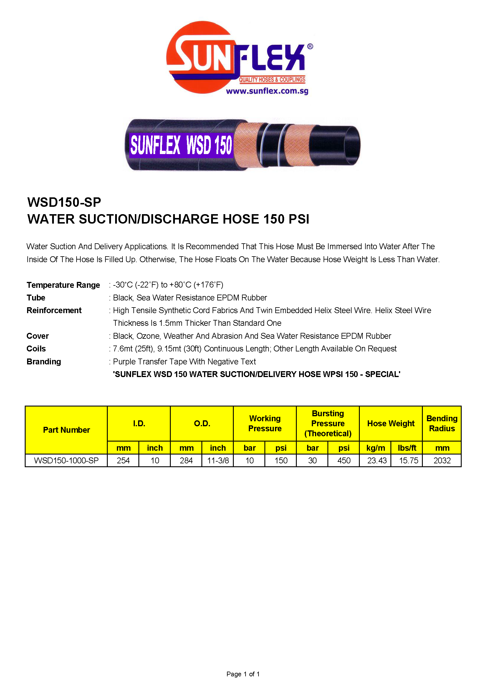 'SUNFLEX WSD 150 WATER SUCTION/DELIVERY HOSE WPSI 150 - SPECIAL'