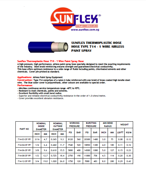E-Catalog > รถยนต์ - ชิ้นส่วนและอะไหล่ผู้ผลิตและขายส่ง > SUNFLEX THERMOPLASTIC HOSE TYPE 714 - 1 WIRE AIRLESS PAINT SPRAY