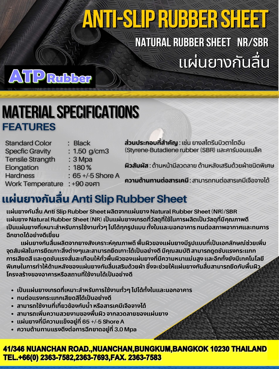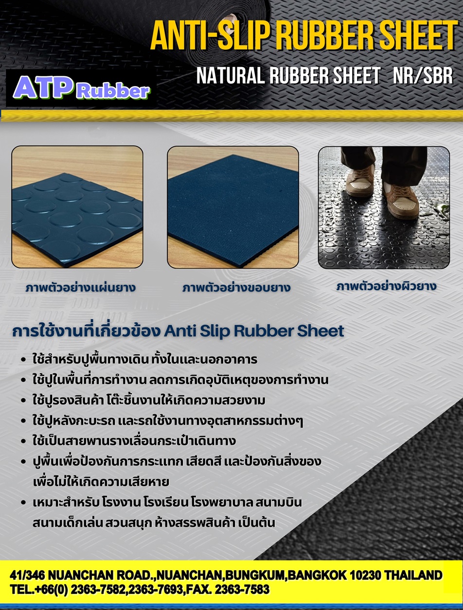 • แผ่นยางกันลื่น (Anti Slip Rubber Sheet) ของ “ATP Rubber” มีความสามารถทนทานต่อน้ำมัน สารเคมี และสภาพอากาศต่างๆได้ในระดับปานกลาง ได้มีการออกแบบมาเป็นพิเศษเพื่อให้สามารถทำความสะอาดได้ง่ายด้วยน้ำ และผงซักฟอก แผ่นยางกันลื่น (Anti Slip Rubber Sheet) ความหนา 3 มิลลิเมตร เหมาะสำหรับงานกันลื่นทั่วๆไป ส่วนพื้นที่ที่มีการใช้งานเป็นอย่างมากจะแนะนำให้ใช้ความหนา 5 มิลลิเมตร