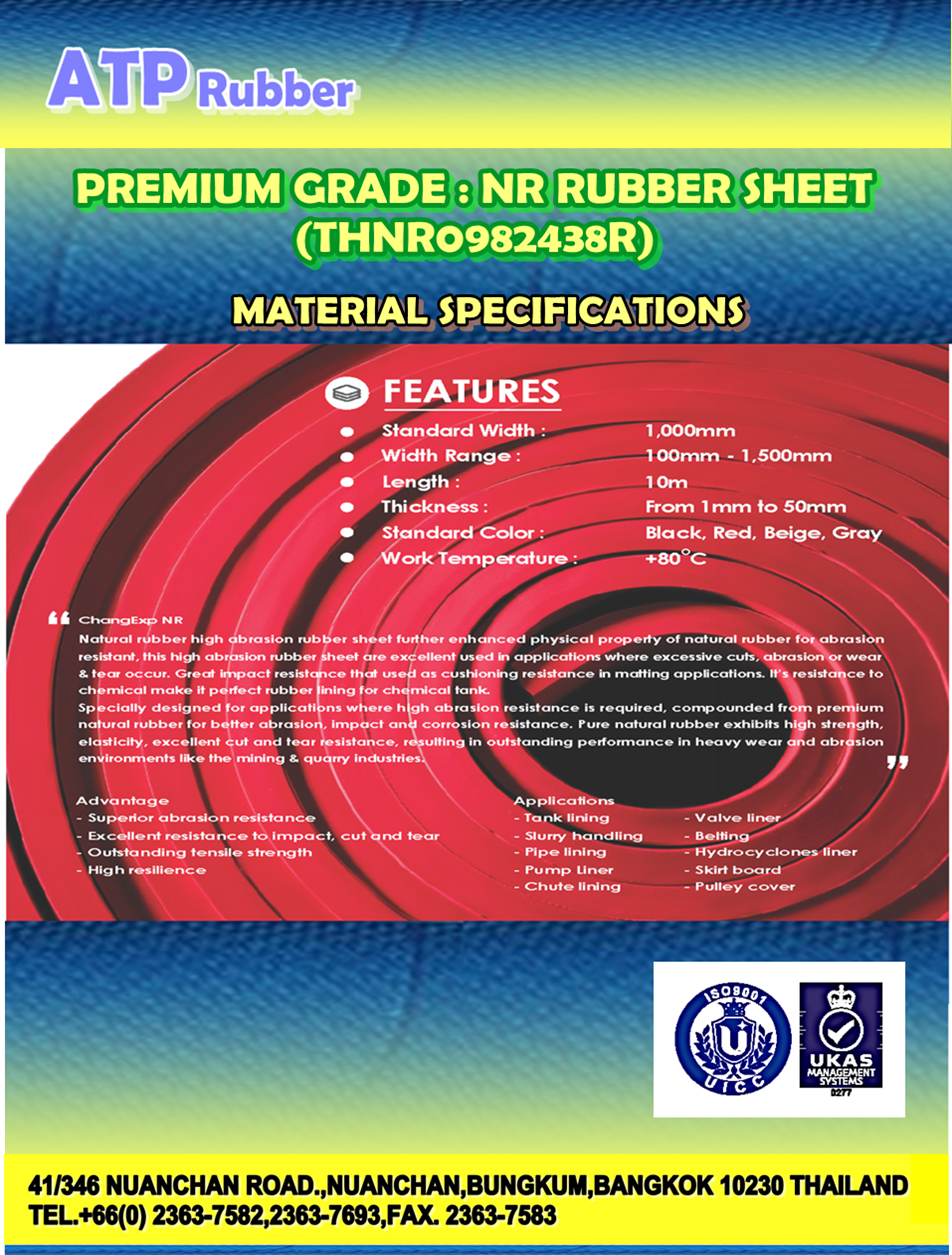 • ยาง NR Rubber Sheet (Natural Rubber Sheet) ทางบริษัทฯ ได้มีการออกแบบมาเป็นพิเศษโดยส่วนประกอบหลักจากยางน้ำยางแท้ 100 % ที่นำมาใช้ในการผลิตนั้นจะทำให้ให้แผ่นยางมีความแข็งแรง และความยืดหยุ่นที่สูงเป็นแผ่นยางที่เหมาะสำหรับการใช้งานที่ต้องการความทนทานในการขูด กระแทก เสียดสีทีสูง และทนต่อการตัดและการฉีกขาดได้อย่างดีเยี่ยม โดยแผ่นยาง NR Rubber Sheet (Natural Rubber Sheet) นี้ยังเหมาะกับการใช้งานหนัก เช่น อุตสาหกรรมเหมืองแร่ และเหมืองหิน เป็นต้น