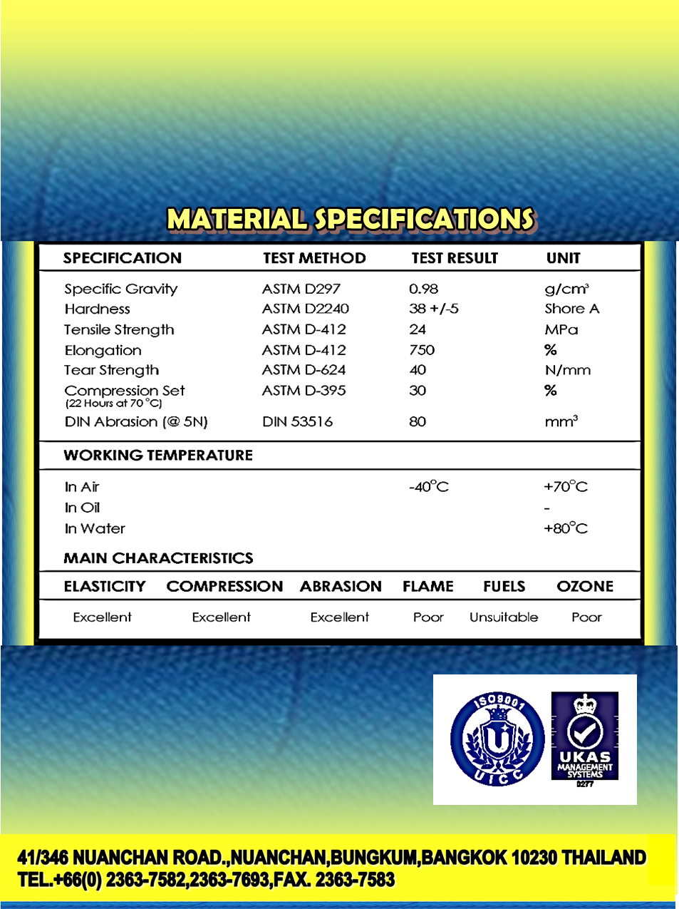 • การยืดตัวที่จุดฉีกขาด (ช่วง %) : 750% • ความแข็ง : 38+/-5 Shore A
