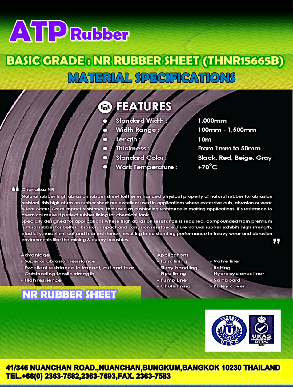 แผ่นยาง Natural Rubber Sheet (NR) เป็นแผ่นยางธรรมชาติที่สามารถทนต่อการขูด กระแทก เสียดสี ได้ดี โดยเฉพาะคุณสมบัติที่ยอดเยี่ยมของแผ่นยาง Natural Rubber Sheet (NR) ทำให้ถูกนำมาใช้กันอย่างมากมายในงานที่มีการตัด การเสียดสี หรือการสึกหรอ และสามารถทนต่อแรงกระแทกได้อย่างดีเยี่ยม ความสามารถที่ทนต่อสารเคมีทำให้เป็นยางที่เหมาะสำหรับนำมาเคลือบถังสารเคมี