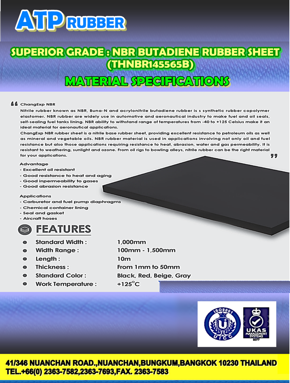 • Nitrile Butadiene Rubber Sheet (NBR Rubber Sheet) is a rubber that is the main choice for applications that require excellent oil resistance, chemical resistance, and is a rubber with good mechanical performance with moderate high temperature applications. It is currently widely used in the automotive industry, oil and gas industry, power plant industry, and engineering industry. It is suitable for making seals and gaskets in applications involving hydrocarbons, chemicals, acids, or bases. In the automotive industry, Nitrile Butadiene Rubber Sheet (NBR Rubber Sheet) is used as various pipes inside car engines, as oil pipes or various fuel pipes, as seals, and rubber grommets, etc. With a temperature range of -30 to +125 degrees Celsius, Nitrile Butadiene Rubber (NBR) can withstand all automotive applications. With this form of synthetic rubber, it is a flexible and perfect material for use in the power plant industry. Used to make Air Lock door seals, swimming pool door seals, Drywell heads, vibration dampers, etc. • “ATP Rubber”: Superior Grade High-quality rubber sheets, which are made from 100% real rubber, will be of high quality. However, it is still a popular grade. Which also has rubber made from 100% real rubber with higher properties and grades