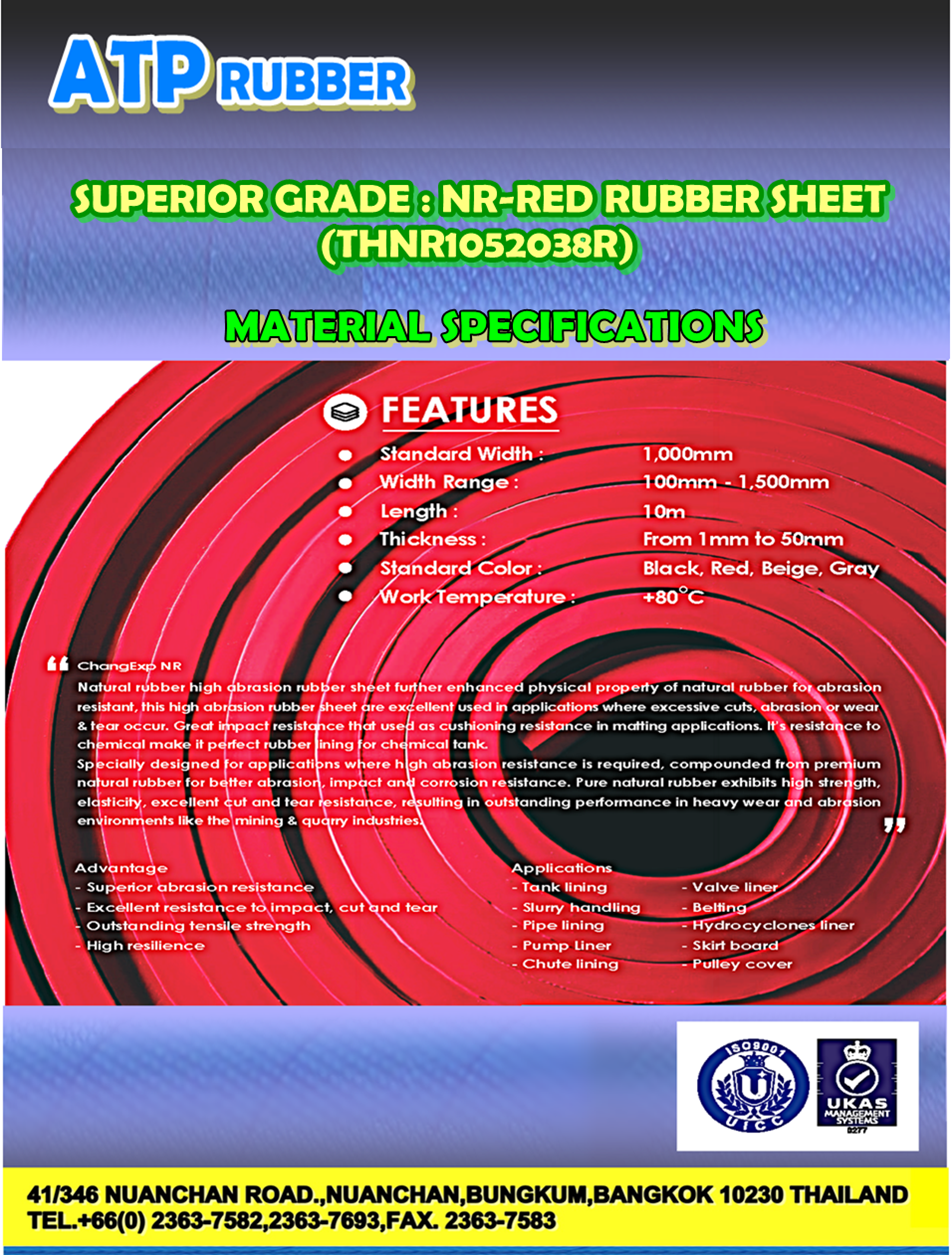 • ยาง NR Rubber Sheet (Natural Rubber Sheet) ทางบริษัทฯ ได้มีการออกแบบมาเป็นพิเศษโดยส่วนประกอบหลักจากยางน้ำยางแท้ 100 % ที่นำมาใช้ในการผลิตนั้นจะทำให้ให้แผ่นยางมีความแข็งแรง และความยืดหยุ่นที่สูงเป็นแผ่นยางที่เหมาะสำหรับการใช้งานที่ต้องการความทนทานในการขูด กระแทก เสียดสีทีสูง และทนต่อการตัดและการฉีกขาดได้อย่างดีเยี่ยม โดยแผ่นยาง NR Rubber Sheet (Natural Rubber Sheet) นี้ยังเหมาะกับการใช้งานหนัก เช่น อุตสาหกรรมเหมืองแร่ และเหมืองหิน เป็นต้น