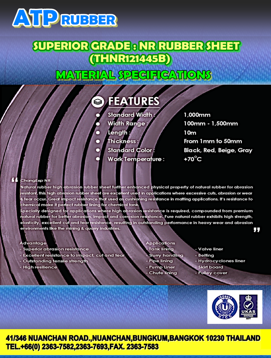 ยาง NR Rubber Sheet (Natural Rubber Sheet) ทางบริษัทฯ ได้มีการออกแบบมาเป็นพิเศษโดยส่วนประกอบหลักจากยางน้ำยางแท้ 100 % ที่นำมาใช้ในการผลิตนั้นจะทำให้ให้แผ่นยางมีความแข็งแรง และความยืดหยุ่นที่สูงเป็นแผ่นยางที่เหมาะสำหรับการใช้งานที่ต้องการความทนทานในการขูด กระแทก เสียดสีทีสูง และทนต่อการตัดและการฉีกขาดได้อย่างดีเยี่ยม โดยแผ่นยาง NR Rubber Sheet (Natural Rubber Sheet) นี้ยังเหมาะกับการใช้งานหนัก เช่น อุตสาหกรรมเหมืองแร่ และเหมืองหิน เป็นต้น