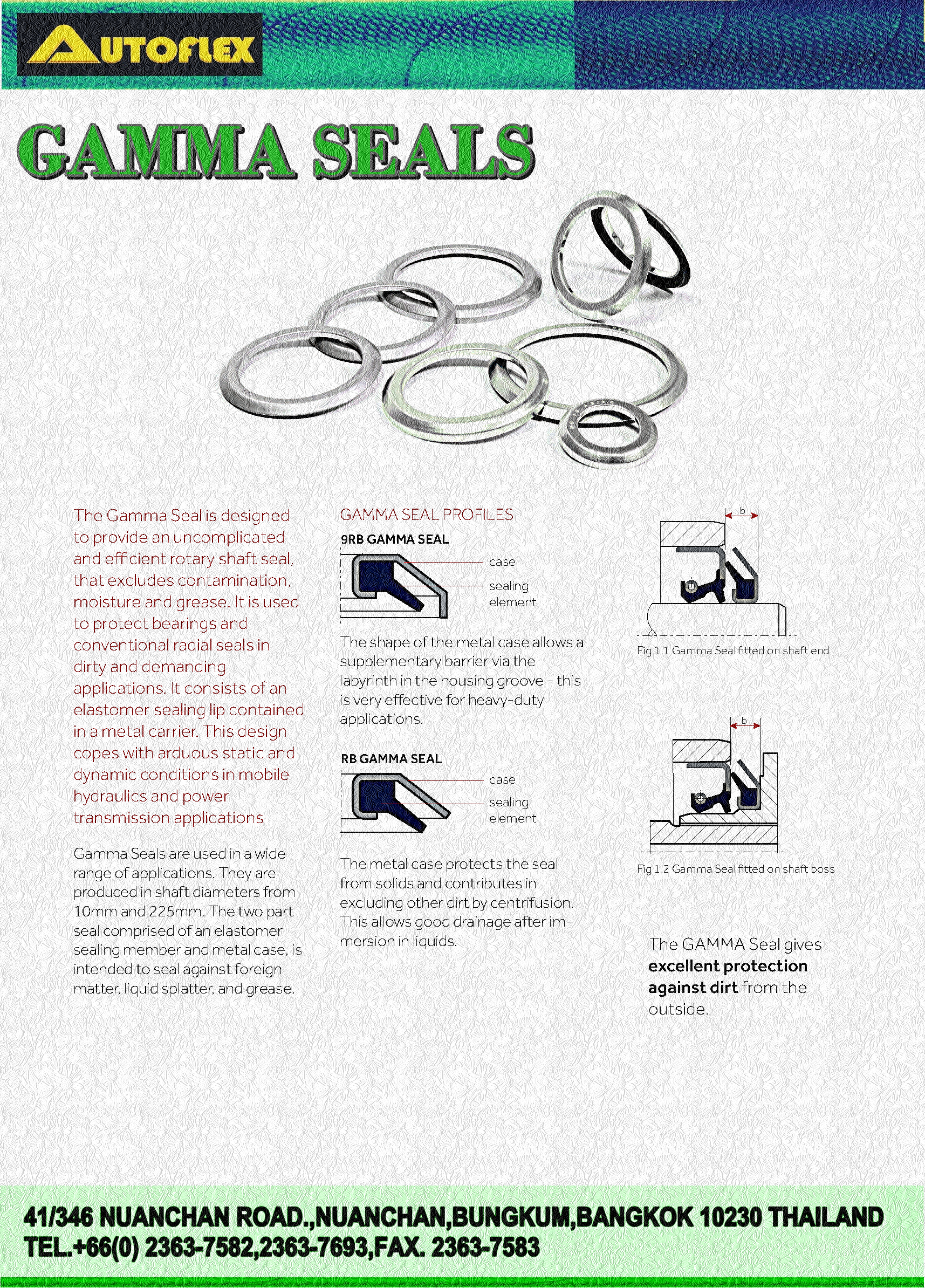 ซีล GAMMA เป็นซีลโรเตอรี่แนวแกนที่ป้องกันสิ่งปนเปื้อน ความชื้น และจารบี ประกอบด้วยขอบซีลอีลาสโตเมอร์ที่บรรจุอยู่ในตัวพาโลหะ การออกแบบนี้เหมาะสำหรับสภาวะคงที่และไดนามิกที่ยากลำบากในระบบไฮดรอลิกเคลื่อนที่และการใช้งานระบบส่งกำลังเป็นซีลแบบหมุนตามแนวแกนที่ป้องกันการปนเปื้อน ความชื้นและไขมัน ประกอบด้วยขอบซีลอีลาสโตเมอร์ที่บรรจุอยู่ในโลหะ